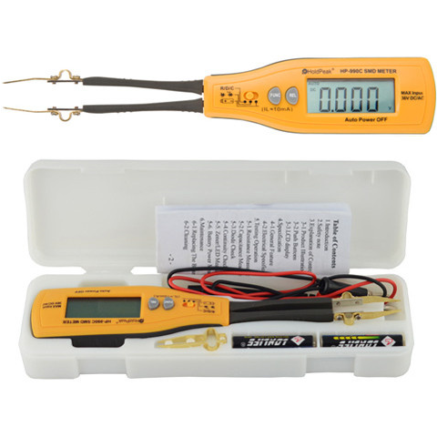 SMD alkatrész teszter, ellenállás, kapacitás, dióda, zener, LED. SMD alkatrészek mérésére alkalmas műszer. A kis méretű alkatrészek esetében csipeszként használva egyszerűen és gyorsan megmérhető ellenállásuk, kapacitásuk, szakadt, vagy zárlatos állapo