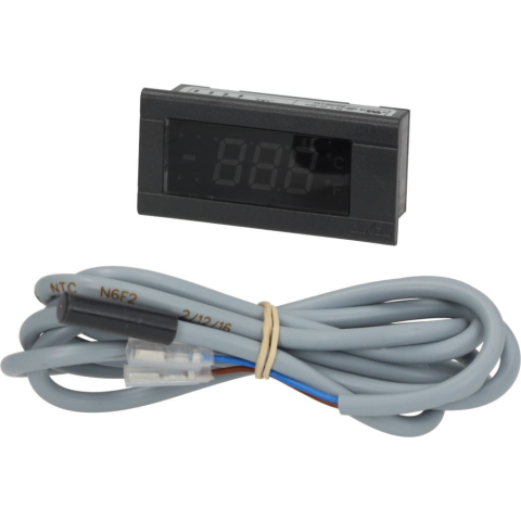 230V 50/60Hz | 3-jegyű kijelző d.p.-val | termosztát beállítási tartomány -40+110°C | teljes NTC szondával 1500 mm | kalibrációs trimmer a hátoldalon | fúrási sablon 26x59 mm