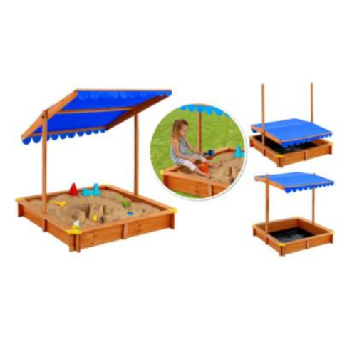 Varázsolj saját tengerpartot a kertedbe ezzel a fenyőfából készült homokozóval! Az állítható, élénk kék árnyékoló tető megbízható védelmet nyújt a perzselő nap, az eső és a lehulló levelek ellen, így a homok mindig tiszta marad. Masszív kerete stabil játé