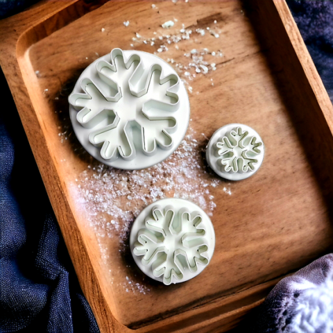 Hópelyheket ábrázoló, 3 részes műanyag rugós fondant kiszúró. Átmérőjük 6 cm, 4 cm, 2.5 cm