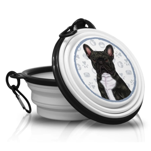 1 kép Hordozható, összecsukható kisállat tál utazáshoz, fekete francia bulldog mintás