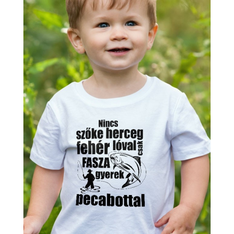 Horgász gyerek póló, fasza gyerek pecabottal. Nincs szőke herceg fehér lóval, csak fasza gyerek pecabottal vicces feliratos gyerek póló egy humoros horgásznak. Rendelj egy ilyen gyerek pólót születésnapjára vagy névnapjára és a jókedv garantáltan nem fog