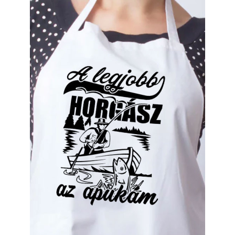 Horgász kötény, a legjobb horgász az apukám. Horgász kötény azoknak, akiknek az édesapjuk a legjobb horgász! Lepd meg egy közös főzés alkalmával, hogy ezt viseled. Mérete 66x78 cm, anyaga vászon, színe fehér vagy fekete. Egyedi mintával ellátott kötény