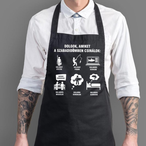 Feliratos kötény, horgászok szabadideje. Vicces kötény feliratokkal, amik egy igazi horgász életét mutatják. Ha tudod, hogy rokonod, horgásztársad is minden szabadidejét a halaknak szenteli, ajándékozd meg születésnapján, karácsonykor egy ilyen köténnyel.