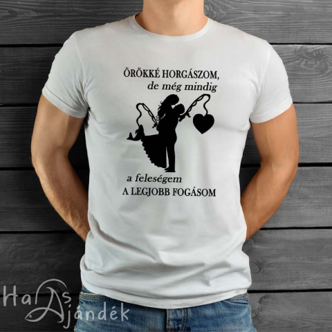 Vicces horgász póló férfiaknak. Örökké horgászom, de még mindig a feleségem a legjobb fogásom feliratos póló férfiaknak. Vicces meglepetés férjeknek apák napjára, évfordulóra is. Nagy szín és méretválaszték, kényelmes pamut póló. Kiváló minőségű férfi