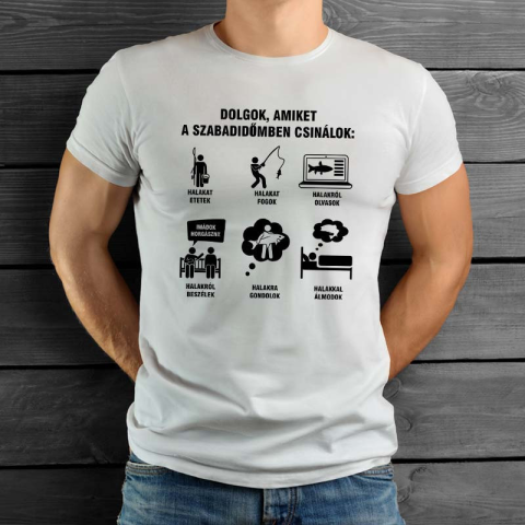 Feliratos póló, horgászok szabadideje. Vicces póló feliratokkal, amik egy igazi horgász életét mutatják. Ha tudod, hogy rokonod, horgásztársad is minden szabadidejét a halaknak szenteli, ajándékozd meg születésnapján, karácsonykor egy ilyen pólóval. A pól