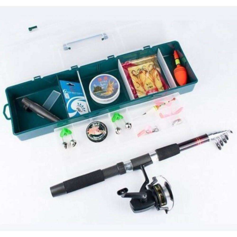 Horgászfelszerelés dobozban, karbonszálas horgászbottal, csalikkal, súlyokkal (BBL)