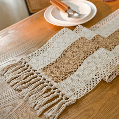Lépj be a stílus és elegancia világába ezzel a horgolt asztali futóval, amely minden étkezés alkalmával varázsolja el az asztalodat. Finoman megmunkált textúrája és bojtos végei elegáns megjelenést kölcsönöznek bármely étkezőasztalnak, legyen szó hétközna