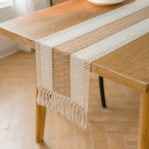 Lépj be a stílus és elegancia világába ezzel a horgolt asztali futóval, amely minden étkezés alkalmával varázsolja el az asztalodat. Finoman megmunkált textúrája és bojtos végei elegáns megjelenést kölcsönöznek bármely étkezőasztalnak, legyen szó hétközna