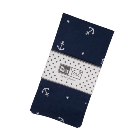 Horgonyos textil szalvétaA textilszalvéták különleges, ötletes és egyedi díszei az asztalnak, használatuk egyben igen környezetbarát és pénztárcakímélő megoldás is. Nem kell minden használat után szemétbe dobni és újat venni, mint a papírszalvétából. Ugyanúgy használhatod étkezés közben, vagy szendvics csomagolására.A szalvéták mérete 33x33 cm. 100% pamutból készültek, mosógépben 40 fokon moshatóak, vasalhatóak.