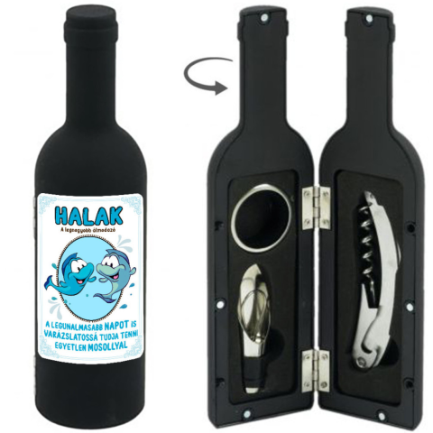 Horoszkópos ajándék Halak csillagjegyű ember számára, aki a legnagyobb álmodozó. A szett anyaga: fém és műanyag A szett tartalma: - Dugóhúzó: Praktikus és könnyen használható bornyitó, amellyel egyszerűen kibonthatod kedvenc borodat.