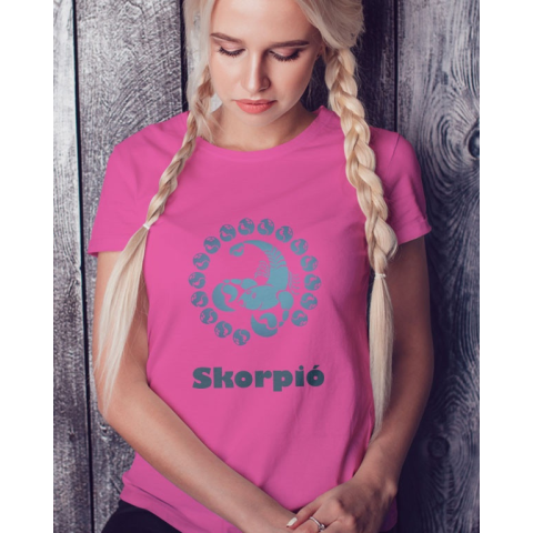 Női póló születésnapra, skorpió horoszkóppal. Skorpió csillagjegyes női póló különleges, egyedi grafikával, többféle méretben, színben és fazonban. Ajándék a skorpió jegyében született nőknek. Póló anyaga 100% pamut. Kiváló minőségű férfi és női pólók,