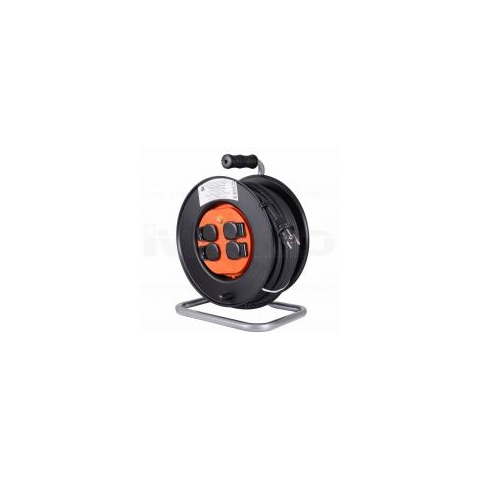 A hosszabbító kábeldob 4 földelt aljzattal, 33 méter hosszú 10 mm széles fekete kábellel és fémvázon forgó, műanyag dobbal készült. Piros színű, túlmelegedés elleni védőgombbal és rugóval ellátott, cseppmentes fedéllel felszerelt. IP54-es védelemmel készült. A kábeldob átmérője 300 mm. Az ergonomikusan kialakított csúszásgátlós fogantyú elősegíti az egyszerűbb és könnyebb szállíthatóságot. A hosszabbító kábeldob praktikus segítség