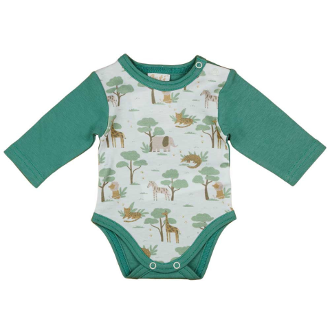 Öltöztesse be csemetéjét ebbe a bájos, állatos mintával díszített, hosszú ujjú baba bodyba! A zöld színű, kiváló minőségű magyar termék bármely kisfiúnak vagy kislánynak remek választás lehet, hiszen unisex kialakítású. A vállán lévő nikkelmentes patentok