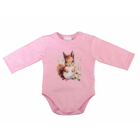 Rózsaszín álomban ringatózzon kisbabád ebben a magyarországi gyártású, hosszú ujjú bodyban, amelyet mókus mintával díszítettünk. Az anyaga 100% pamut, így biztosítja a bőr lélegzését és a kényelmet a nap minden pillanatában. A vállán található patentok se