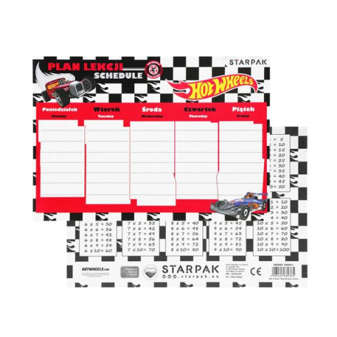 Hot Wheels órarend és szorzótáblagyerekeknek – Starpak 560051Ez a vidám és színes Hot Wheels órarend ideális választás iskolás gyermekek számára. A jól strukturált, hétfőtől péntekig beosztott táblázat segítségével könnyedén rendszerezhetőek az iskolai órák. A hátoldalon található szorzótábla pedig segíti a matematika tanulását is.Tulajdonságok:Hot Wheels dizájn – kedvelt motívum kisfiúk számáraHeti beosztás: hétfőtől péntekig (lengyel és ang