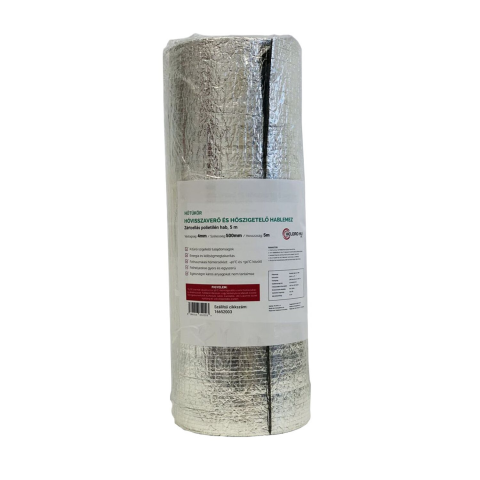 Hőtükör - Reflektív hővisszaverő és hőszigetelő PE hablemez, tekercsben. Ajánlott radiátorok mögé és hideg beltéri falfelületekre. Max. hőterhelés 90°C, alkalmazása tilos fűtőberendezések vagy kéménykivezetések szigetelésére. Falfelületre ragasztása a mellékelt utasítás szerint. Vastagság: 4 mm. Tekercsszélesség: 500 mm. Tekercshossz: 5 fm