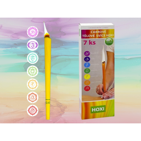 HOXI csakragyertyák az egyes csakrák energiájának kiegyensúlyozásához. Kézzel készültek 100% pamutvászonból. Az optimális 25 cm hosszúságú tölcsér alakjuknak köszönhetően kiváló hatásfokkal rendelkeznek. Minden testgyertya biztonsági gézfilterrel van ellátva.
