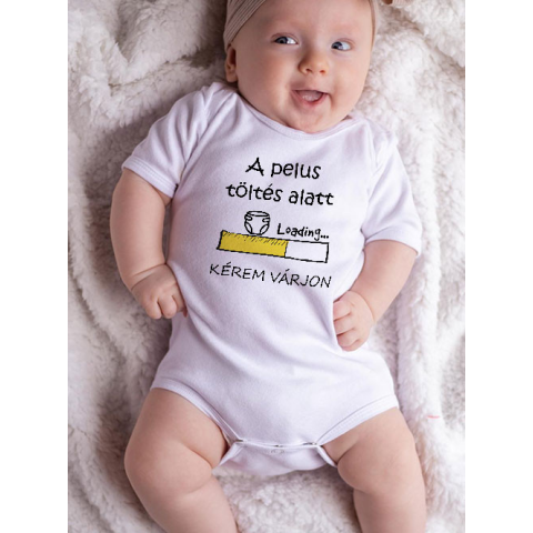 Egy igazi humorbomba a legkisebbeknek! Ez a vicces feliratú baba body tökéletes választás mindazoknak, akik szeretik a kreatív ajándékokat. A „A pelus töltés alatt – kérem várjon” szöveg garantáltan mosolyt csal minden szülő és látogató arcára. A kombidre