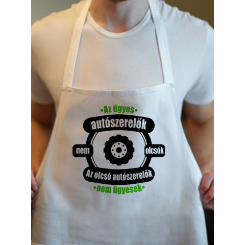 Humoros kötény, ügyes autószerelő. Az ügyes autószerelők nem olcsók, az olcsó autószerelők nem ügyesek, nagy igazság egy feliratos kötényen. Ajándék autószerelőknek, a kocsik mesterének! Praktikus és hasznos kiegészítő. A kötény fekete és fehér színben is