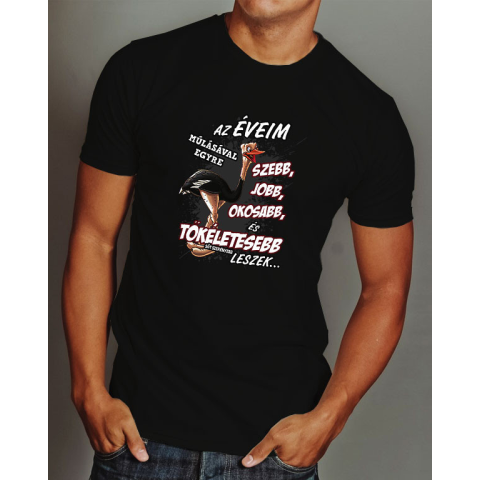 Humoros születésnapi póló, éveim múlásával. Az éveim múlásával egyre szebb, jobb, okosabb és tökéletesebb, sőt szerényebb leszek feliratos póló tréfás mintával. Ajándék kollégának, barátnak, családtagnak születésnapra. A póló anyaga 100% pamut ami többfél