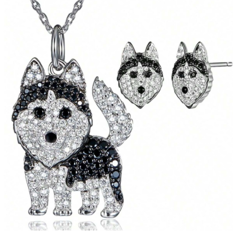Ez a lenyűgöző Husky mintás ékszer szett tökéletes választás minden kutyabarát számára. A szett tartalmaz egy pár finoman kidolgozott fülbevalót és egy hozzá illő nyakláncot, amelyek a Husky kutyák ikonikus megjelenését idézik.