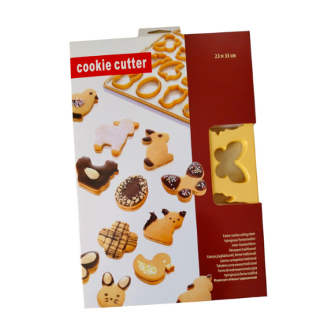 Műanyag, tojás, nyuszi, pillangó, csibe, cica, kacsa, tyúk, és négylevelű lóhere formákat tartalmazó süteménykiszúró rács, tésztaleválasztó elemmel. Mérete 23 cm x 33 cm