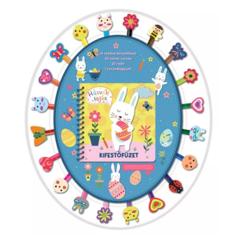 A Húsvéti tojás kifestőfüzet színes és kreatív időtöltést kínál a gyerekeknek húsvéti motívumokkal. A 16 oldalas füzetben nyuszik, csibék és tojások várnak színezésre, a mellékelt ceruzakészlet pedig mindent biztosít a rajzoláshoz: 20 ceruzát, 20 radírt és egy ceruzahegyezőt. Fejleszti a gyerekek kreativitását és kézügyességét, miközben a húsvét varázslatos hangulatát hozza közelebb.