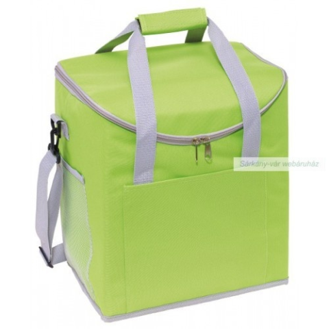 FROSTY hűtőtáska : az elején becsúsztatós zsebbel, szigetelt cipzáras fő rekesszel, 2 db hálós zsebbel az oldalán, megerősített fülekkel, állítható és levehető vállpánttal – ideális piknikhez, barbecuehoz és utazáshoz Mérete: 32 x 23 x 37 cm Rendelésre