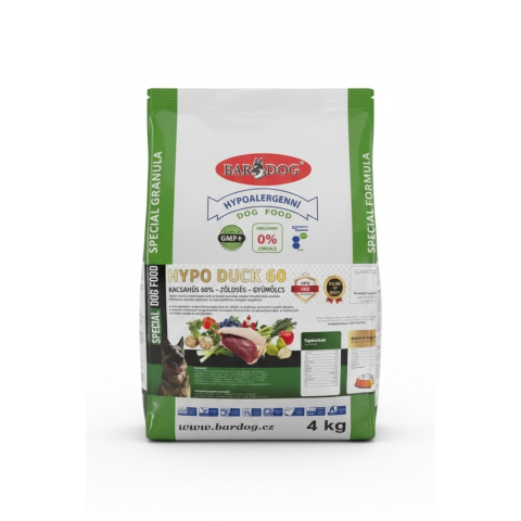 A Hypo Duck 60 kifejezetten érzékeny emésztésű, táplálék-intoleranciával küzdő, valamint a hagyományos húsokra és gabonafélékre allergiás kutyák számára készült. Gabonamentes receptúrája és kiváló minőségű kacsahús-tartalma minden fajtának és testméretnek ideális választás.
