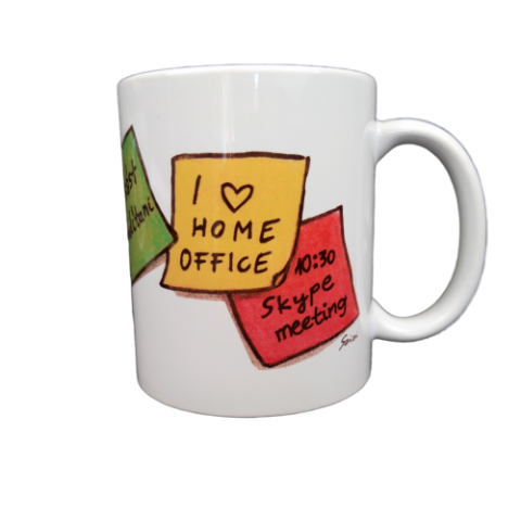 I love homeoffice bögreVicces feliratú post-it emlékeztetők rajzával díszített bögre.A porcelán bögre saját kézi rajz alapján szublimációs technikával lett elkészítve. Mikrohullámú sütőbe betehető, mosogatógépben tisztítható.