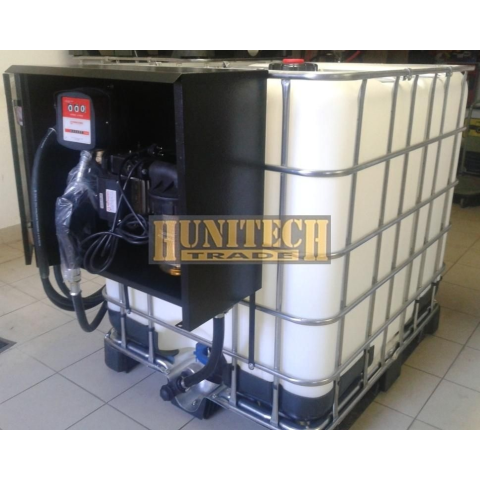 1 kép IBC tartály 1000 literes + Kit Equipe 230V. gázolajszivattyú, mechanikus átfolyás-mérővel,