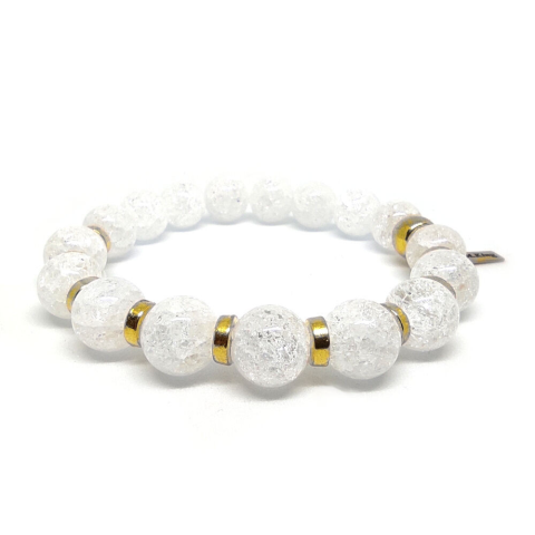 RUGALMAS KARKÖTŐ, a mérete választható. Az ékszer ásványai és tartozékai: – 8 mm-es és 10 mm-es fehér roppantott Hegyikristály ásványok – Arany színű köves strasszos díszek – M.King márkajelzésű nemesacél logóbiléta. –