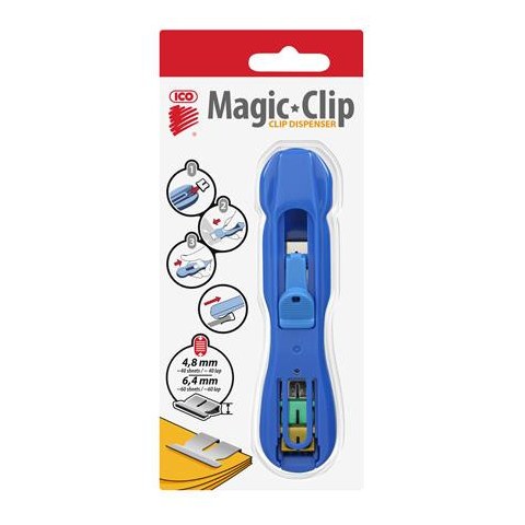 Kapocs adagoló, kapoccsal, ICO Magic Clipper - speciális fűzőszerkezet a lapok gyors, roncsolásmentes összefogásához - a kapcsok korlátlanul újrahasználhatók - az adagoló feltöltve kerül forgalomba - a 4,8 mm-es és a 6,4 mm-es kapoccsal egyaránt haszná