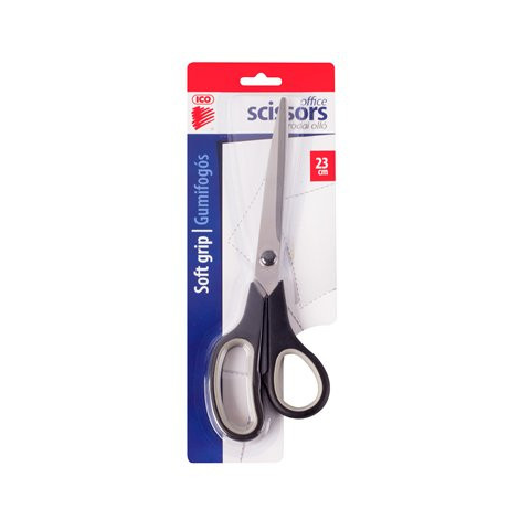 Olló, irodai, 23 cm, gumi fogós, ICO, fekete irodai olló rozsdamentes acél vágóél gumi borítású műanyag fogórész méret: 23 cm Gyártó/első EU forgalmazó elérhetősége: ICO ZRT 2013 Pomáz, ICO út 5.; EU post@ico.eu www.ico.eu