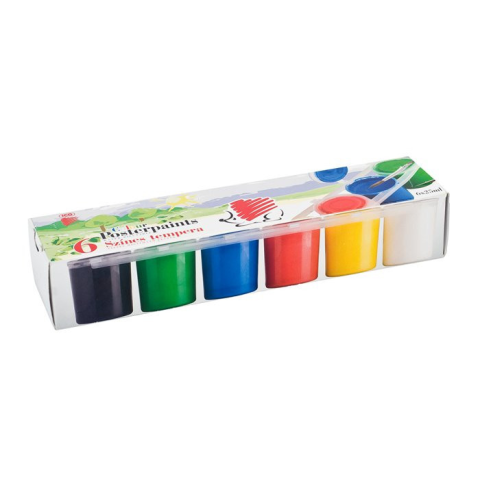 Tempera készlet, tégelyes, ICO Süni, 6 különböző szín - jól fedő, élénk színek - tégelyes kiszerelés - 25 ml/tégely - színek: fekete, zöld, kék, piros, sárga, fehér Gyártó/első EU forgalmazó elérhetősége: ICO ZRT 2013 Pomáz, ICO út 5.; EU post@ico.eu