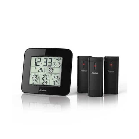 Időjárás állomás HAMA EWS-Trio 3 külső érzékelővel fekete DCF rádiós óra, amely automatikusan beállítja a készülék óráját Négyrészes készlet, amely bázisállomást és három rádiós kültéri érzékelőt tartalmaz az idő, a hét napja, a dátum, a hőmérséklet é