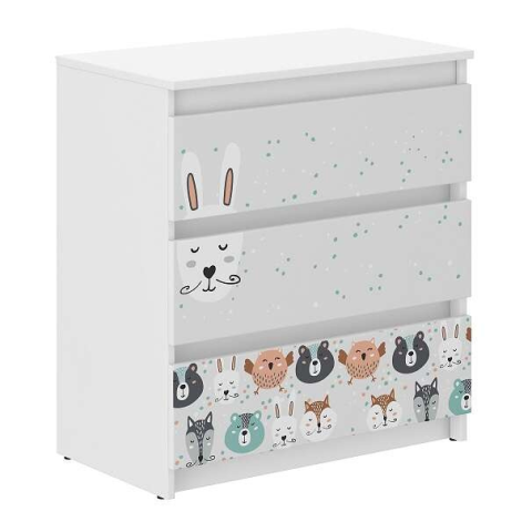 Vidám, állatmintás 3 fiókos komód gyerekszobába 🐰🐻🦊 Ez a modern és praktikus komód tökéletes választás a gyerekszobába! Vidám erdei állatmintái feldobják a szobát, míg a három fiók elegendő helyet biztosít a játékok, ruhák és egyéb holmik tárolásá...