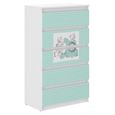 5 Fiókos Gyermek Komód - Vidám Egér Mintával 🐭 Ez a bájos, 5 fiókos komód tökéletes választás gyermeked szobájába! Praktikus tárolóhelyet biztosít játékoknak, ruháknak és egyéb holmiknak, miközben vidám, színes megjelenésével feldobja a helyiséget....