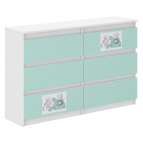 Vidám, 6 fiókos ifjúsági komód 120 cm széles – Tökéletes a gyerekszoba rendbetételéhez! 🌈 Ezzel a csinos, türkiz és fehér komóddal könnyedén rendet teremthetsz gyermeked szobájában! A hat tágas fiók rengeteg helyet biztosít játékoknak, ruháknak és e...