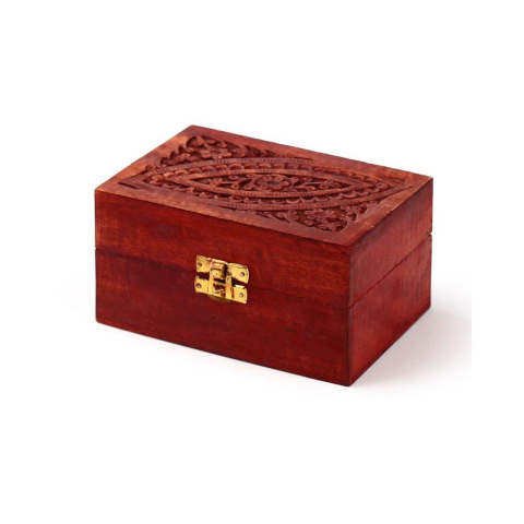 Tömörfa illóolaj tartó doboz. Természetes mangófa alapanyagból készült, kézműves termék, kézi faragású díszítéssel. Ebben a kis praktikus illóolaj tartóban összesen 12 db illóolajat tárolhatsz. Mivel kézi faragással készültek a díszítő motívumok, így az egyes dobozok nem egyformák, minden darab egyedi.