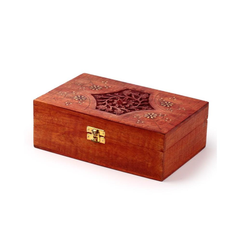 Tömörfa illóolaj tartó doboz. Természetes mangófa alapanyagból készült, kézműves termék, kézi faragású díszítéssel. Ebben a kis praktikus illóolaj tartóban összesen 24 db illóolajat tárolhatsz. Egyes darabok sárgaréz részletekkel is ki vannak egészítve. Mivel kézi faragással készültek a díszítő motívumok, így az egyes dobozok nem egyformák, minden darab egyedi.