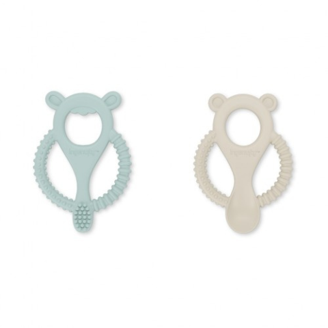A szilikon és a texturált felület segít masszírozni a baba ínyét. Ergonomikus kialakítása könnyen megfogható a kis kezek számára. Az esztétikus, nemsemleges színek bárány és mackó alakban teszik ezt a készletet ajándékozásra kiválóvá. A nyugtató an