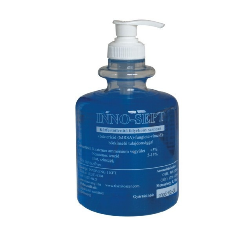 Inno-sept kézfertőtlenítő Inno-Sept kéz fertőtlenítő szappan - 500ml Higéniás kézfertőtlenítő koncentrátum bőrkímélő tulajdonsággal, baktericid (MRSA is), fungicid, virucid, tuberkolocid. Kézfertőtlenítő tulajdonságok: kiszerelés 0,5 l pumpás adago