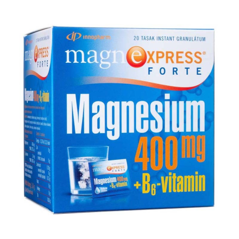 MagnExpress Forte magnézium tartalmú citrom ízű étrend-kiegészítő granulátum édesítőszerekkel. 1 adagja 400 mg elemi magnéziumot tartalmaz.