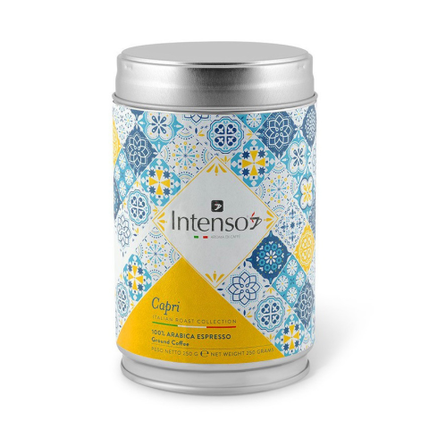 Intenso Capri 100% Arabica nápolyi őrölt kávé kellemes és gazdag aromával, karamellás és kakaós ízjegyekkel, gyönyörű mogyorószínű vastag krémmel és bársonyos textúrával. Az Intenso Capri művészi igényességű mintazatú elegáns