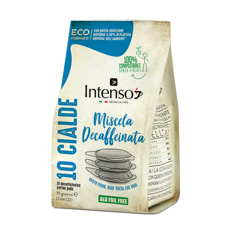 Intenso Decaffainato koffein mentes ESE Pod, testes, karakteres, erőteljes és krémes kávé izgalmas és gazdag aromákkal - teljes értékű kávé élmény legfeljebb 0,1% koffein tartalommal. Komposztálható papír podok környezetkímélő 10 db-