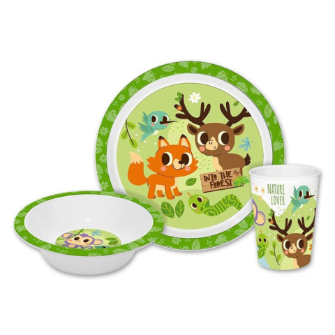 Into the Forest, Állatos étkészlet, micro műanyag szettCsomagolt termék.A termék anyaga: műanyag BPA mentes!A készlet tartalma:1 db mély tálka (Mikrózható műanyag)1 db lapostányér (Mikrózható műanyag)1 db pohár 260 ml (Mikrózható mű