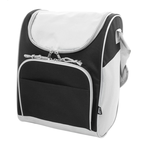 RPET hűtőtáska alumínium béléssel. 2 cipzáras rekesszel, kis elülső zsebbel és állítható vállpánttal. 600D RPET poliészter, megkülönböztető RPET címkével.