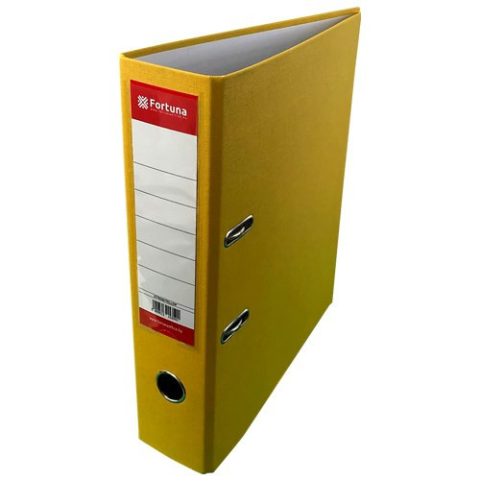 Iratrendező FORTUNA A/4 75 mm citrom Közkedvelt iratrendező. Kívül műanyag, belül papírborítású. 7,5 cm-es gerinc. A gerincre hegesztett címketaró 195 mm hosszú. A cserélhető címke egyszínnyomott. Kihúzógyűrűvel ellátva. Az iratrendező záródását